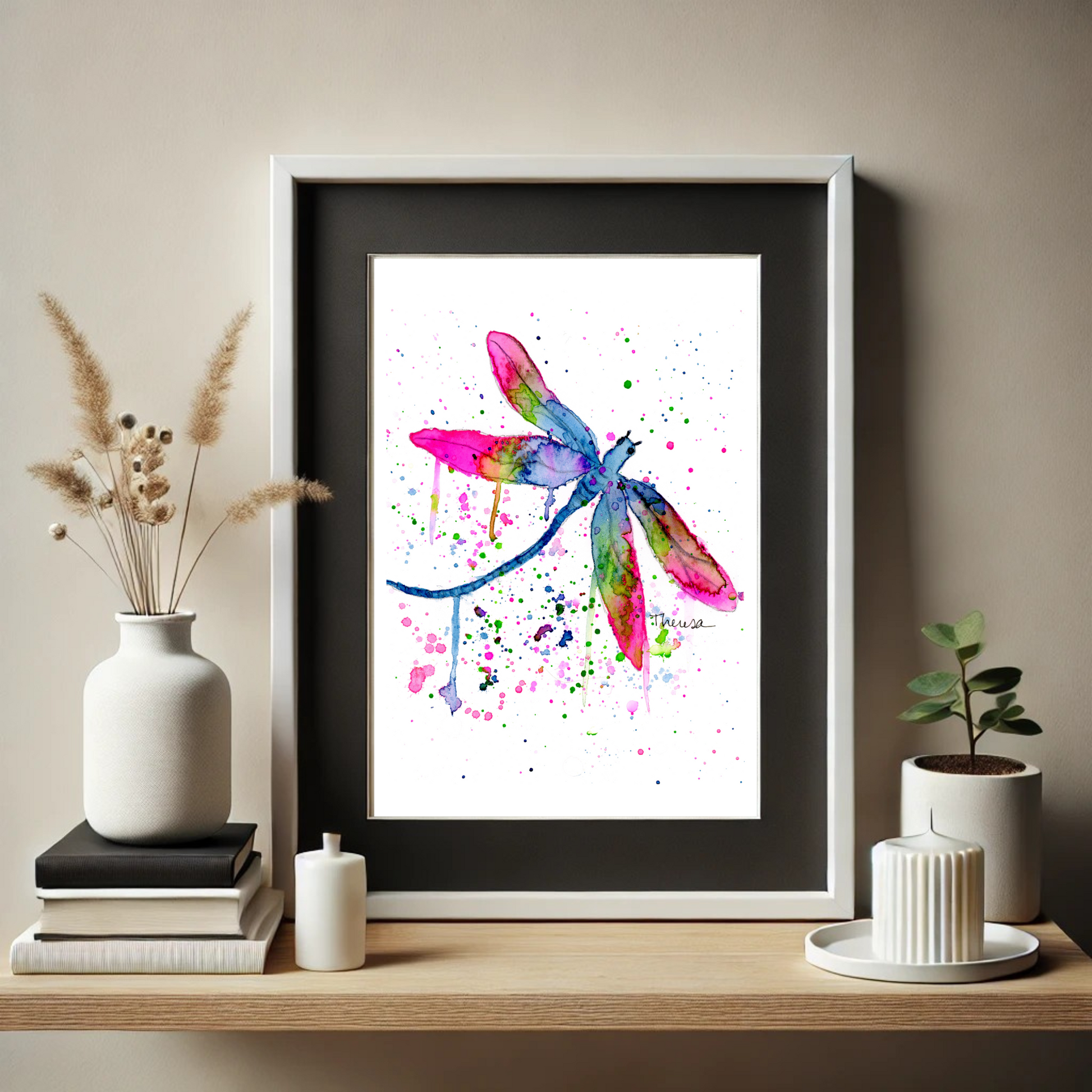 This whimsical dragonfly print bursts with bright pinks, blues, and greens, capturing a sense of lively motion. Perfect for dragonfly lovers, it adds a playful and colorful touch to any room, bringing nature’s charm indoors with a fun, energetic vibe.