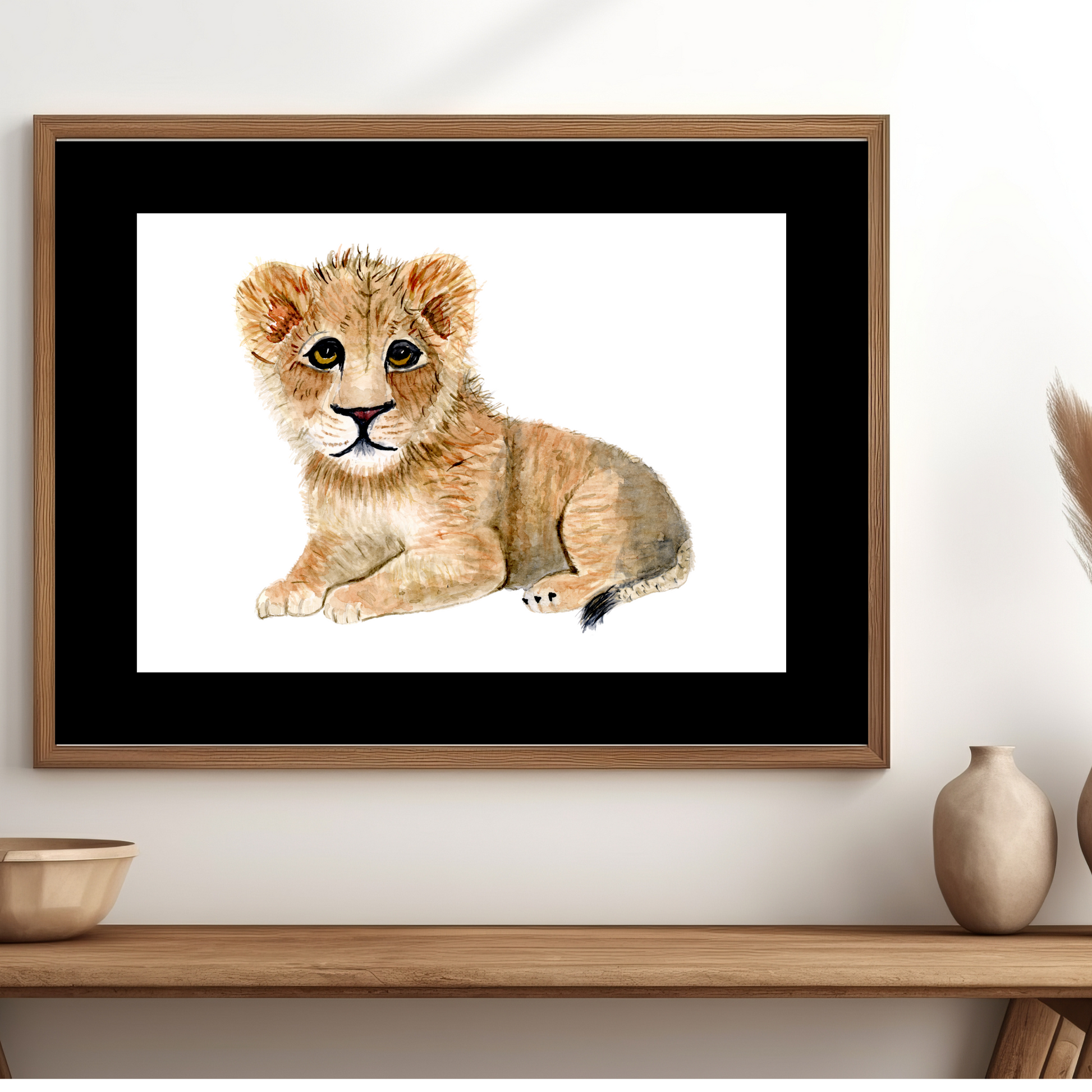 Invite warmth and charm into your nursery or any room with this playful Lion Cub Print. Its gentle, adorable design pairs perfectly with other safari baby prints, creating a sweet and cohesive safari-themed space full of joy and imagination.