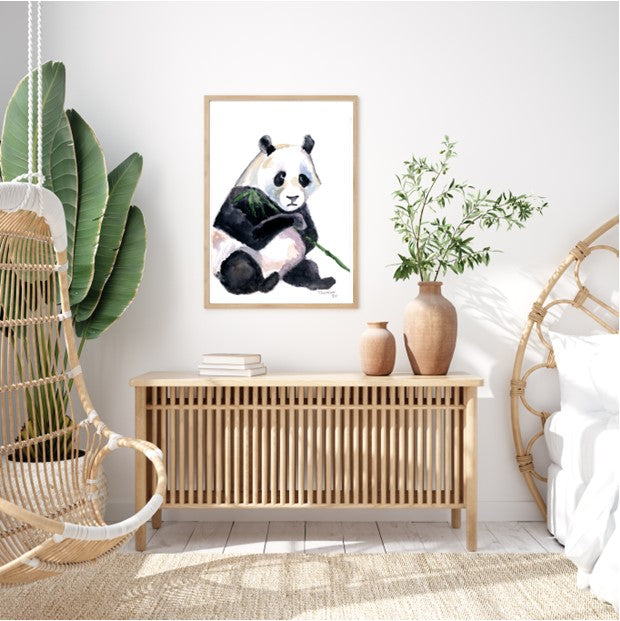 This playful panda art print features an innocent and sweet panda relaxing while holding bamboo. Its charming design adds a touch of warmth and joy to any room, making it perfect for nurseries, playrooms, or cozy corners. Brighten your space with this delightful piece that brings a gentle, cheerful vibe wherever it’s displayed.