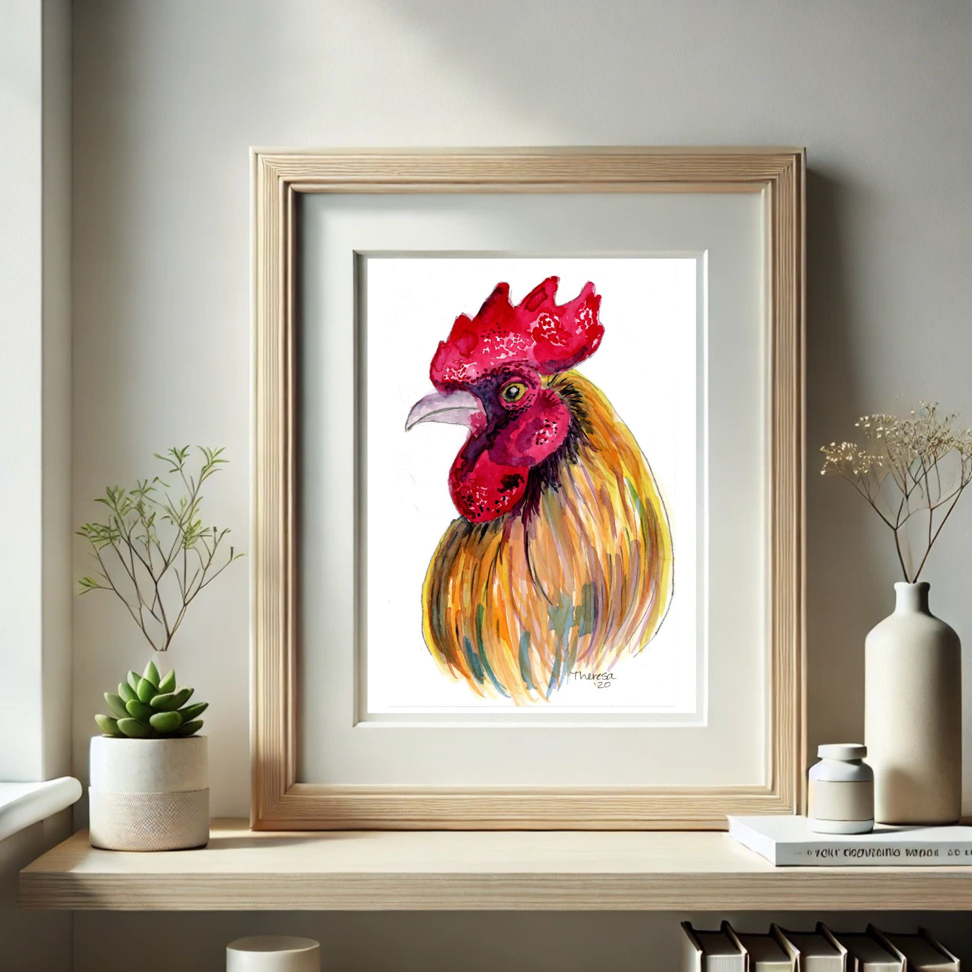 Bring a splash of farmyard charm to your space with this playful rooster art print. Featuring vibrant golds and reds, this lively portrait captures the spirited personality of a rooster, making it a perfect addition for anyone who loves farm animals. Brighten your walls with a touch of rustic fun and bold color.